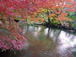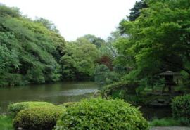 細川家下屋敷の庭園の跡地をそのまま公園にした回遊式泉水庭園です。落ち着いたたたずまいのこの庭園の中心には池があり、背後の台地を山に見立てています。その斜面地は深い木立となっていて、池に覆いかぶさるようにヤマモミジやハゼノキの一群が、秋には真っ赤に紅葉した姿を水面に映し出します。春には桜、冬には雪吊りが見られ、四季折々の風情を楽しめます。