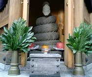 宗慶寺を出て、吹上坂を春日通りへもどり、エイザイの前の交差点を左折します。しばらく歩いて、比較的広い交差を右折すると真珠院(小石川3-7-4)に着きます。本堂右手の階段を上ったところのお堂に、小さな木彫の布袋様が祭られています。さらに本堂下の通路を抜けると裏手が墓地になっていて、大きな布袋様の石像がありました。清廉度量の神様です。