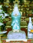徳雲寺を出て、春日通りを右手に歩きます。播磨坂を左に下り、「播磨坂桜並木」の交差点を右折して吹上坂を左折すると、「七福神」という赤いのぼりがたっているマンションの庭への入り口が見えます。ここを入ると、すぐに「極楽水(この下)」という看板があります。この祠が、極楽水(小石川4-16-13)の弁財天です。こちらは白蛇で、七福神唯一の女性の神様です。