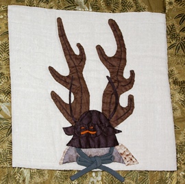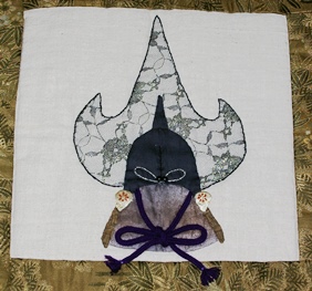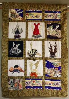 イギリスのリーズに王立武具博物館がオープンした時に、博物館でキルト展が開かれました。その時に招待展示のお話をいただいて、制作したキルトです。武具にちなんで、さまざまな形の兜をアップリケしました。レースやラメの布、羽織の紐など、兜にぴったりの材料を苦労して探したのも楽しい思い出です。オーストラリアでも展示されました