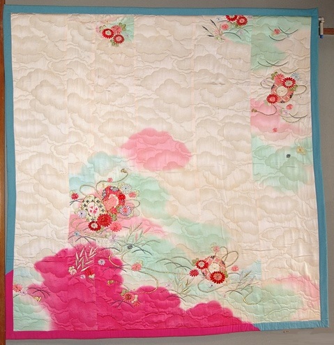 古い着物地を売っているお店で、きれいな色の布を見つけました。着物をほどいたものですが、小さく切るのに忍びなくて、大きなまま、柄を生かしてキルトに仕立てました。わたしが作った和キルトの一作目です。